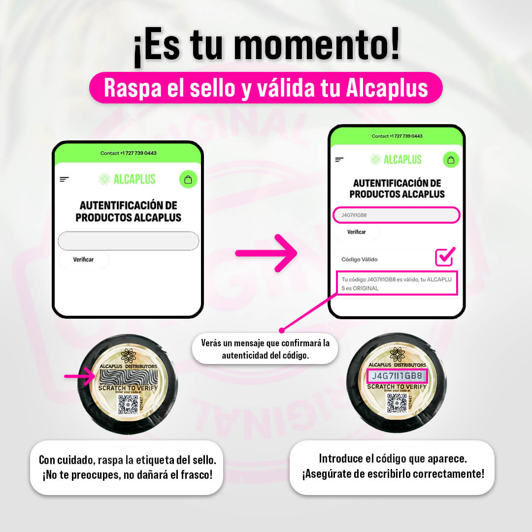 Garantizamos la autenticidad de ALCAPLUS 100% original, respaldado por nuestro sello de autenticidad ubicado en la parte superior del frasco. Antes de consumirlo, asegúrate de verificar este sello para confirmar que estás adquiriendo un producto legítimo y seguro. Somos los únicos vendedores autorizados en MercadoLibre, por lo que te recomendamos evitar imitaciones y compras a terceros no certificados. ¡Confía en la calidad y obtén los mejores resultados con el producto original!
